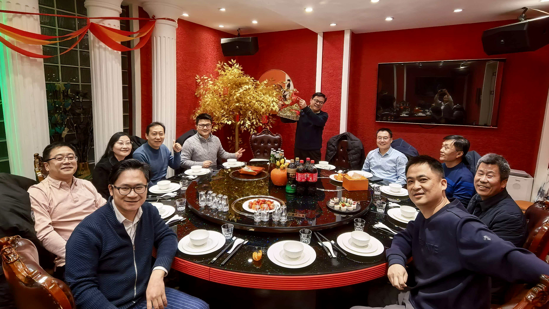 晚宴的最后,全场起立,共同唱响《没有共产党就没有新中国》。铿锵的旋律中,所有人目光坚定,紧握拳头——这一刻,家国情怀与团队精神交织共鸣,为这场迟来的宴会画上了最圆满的句号。