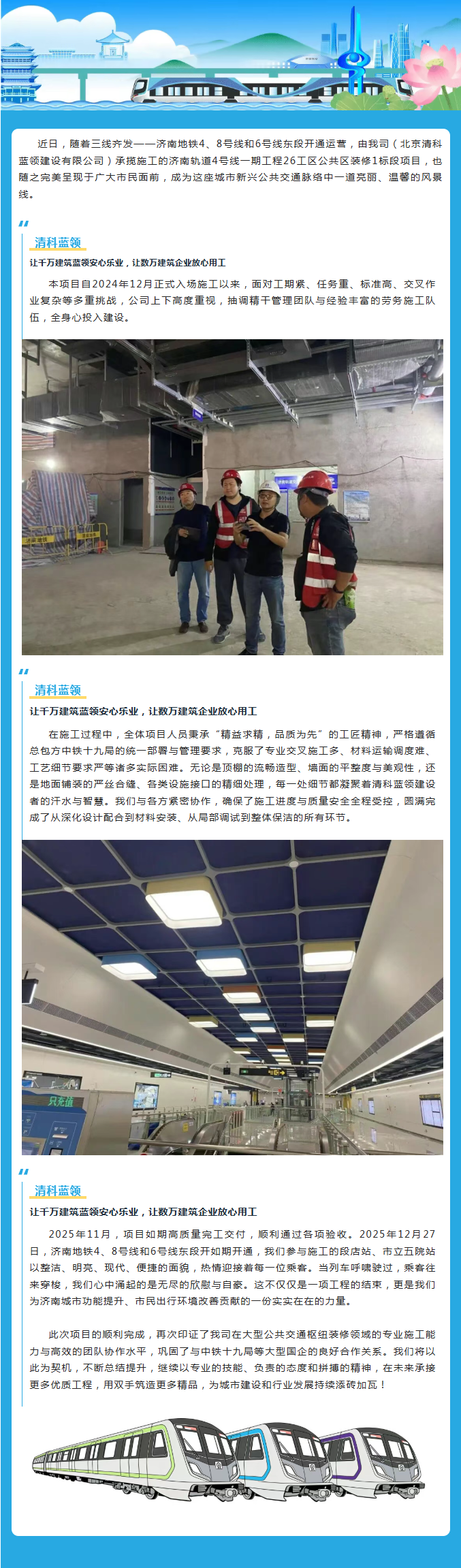 匠心筑就城市动脉:清科蓝领建设圆满完成济南轨道交通4号线公共区装修工程
